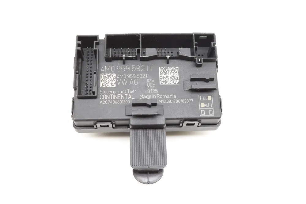 The Door Control Module (OEM Part Number 4M0959592H) is a critical component located in the front right of the vehicle, primarily responsible for controlling various functions associated with the door systems. This module interfaces with the door locking mechanism, window regulators, and mirror adjustments, ensuring synchronized operation for user convenience and safety.Common issues requiring replacement include unresponsive locks or windows, malfunctioning mirrors, or intermittent door light activation. This authentic OEM part is compatible with 2017-2021 Audi A4, A4 Allroad, A5, S4, S5, and RS5 models, among others. It may also be referred to as Electric Control. Other compatible part numbers include 4M0959795H and 8W6971104D. For optimal performance, ensure the replacement part aligns with the vehicle’s specifics.