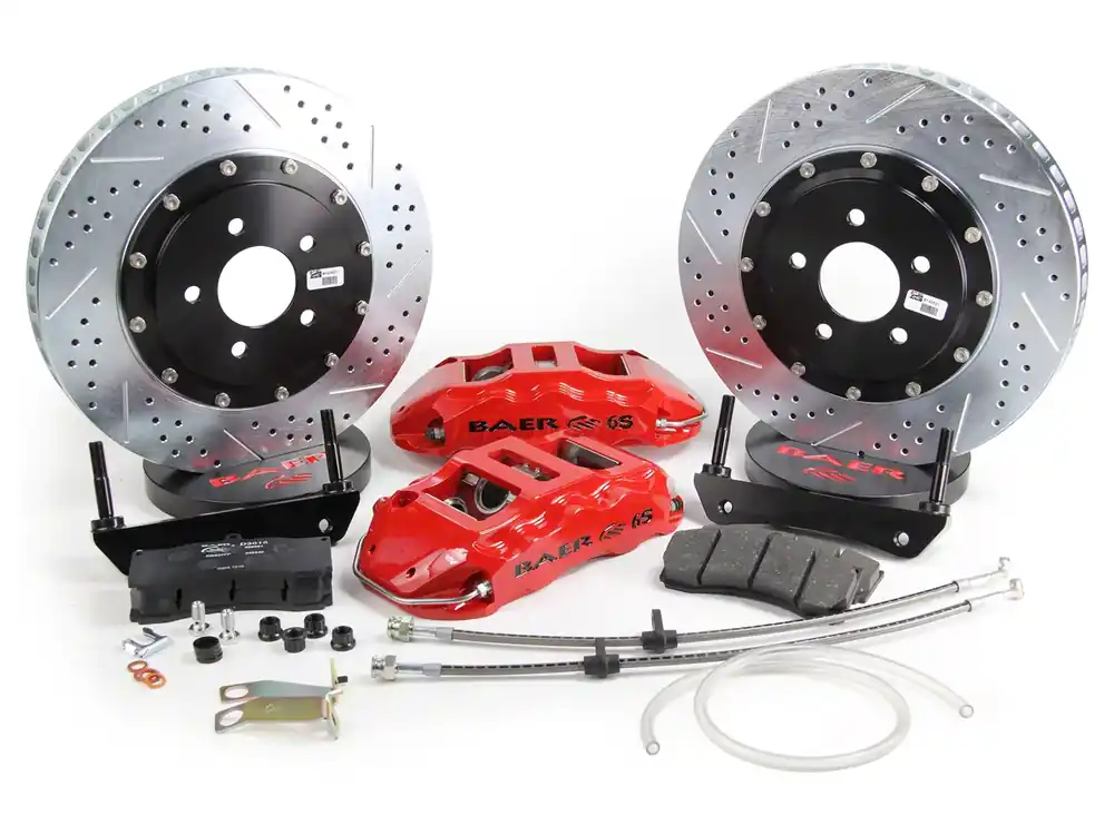Complete Kit. This Baer Extreme Plus Front Brake upgrade kit includes 6S 6-Piston MonoBlock calipers, high performance brake pads, two piece 14″ zinc coated cross drilled and slotted rotors, and braided stainless steelbrake lines.