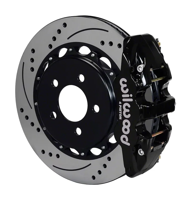 Detailed Fabrication. Introducing the Wilwood AERO4 Rear Big Brake Kit, perfect for high-performance street or track racing, or everyday use. With 14.25-inch drilled and slotted rotors, this brake kit provides maximum braking efficiency with minimal brake dust build-up. The factory disc spindle type is a fixed-mount hat type, while the AERO4 caliper type is a radial-mount type. The ventilated rotor helps to keep your brakes cooler for longer during intense use.
